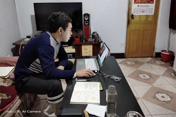 志愿者张乾龙在家中对医护人员子女进行线上辅导