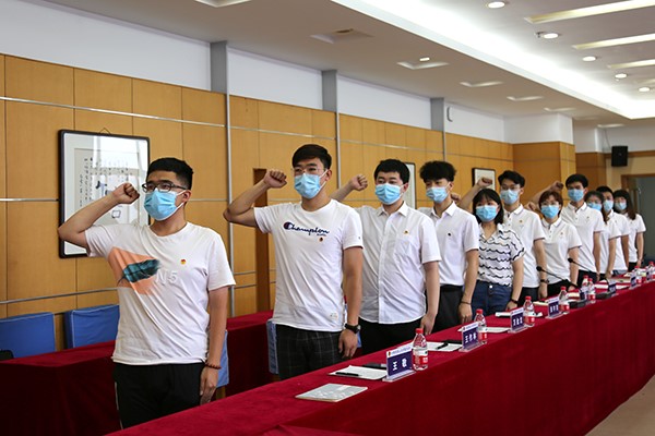 在学校的殷殷嘱托下,11位志愿者举起右拳,庄严宣誓。黄晟代表学校为“西部计划”志愿者和研究生支教团分别授旗。