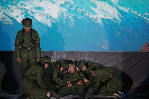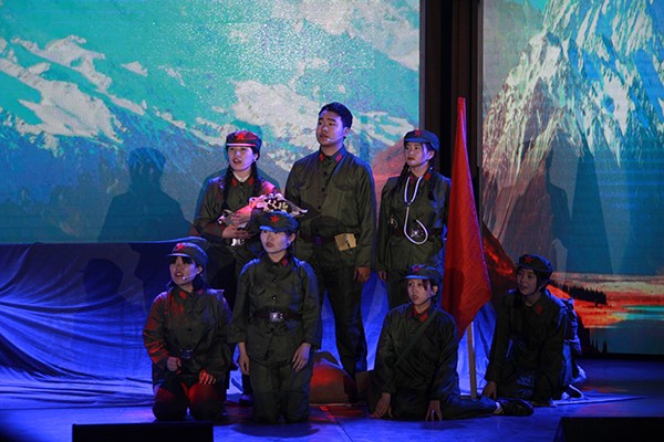 话剧《我在天堂等你》选段“雪山上的牦牛和炊事员之死”,讲述的是在五十年的时间跨度和人民解放军进藏筑路的大背景下,在雪域高原运输物资的途中,团长欧战军、女兵白雪梅、医生辛明、队长苏玉英等人为了保护解放军物资放弃小我,一心为国的故事。历经近一个半月的辛勤排练,话剧团成员通过对人物神情、动作的认真揣摩,对叙述细节的仔细把握,营造了一个悲壮的感人故事,再现了人民解放军在冰山雪域的艰苦环境下百折不挠的意志和对内心信仰的坚守,以话剧的形式表达了对解放军的礼赞。当天在演出现场,成员的精彩演出对人物进行了高度还原,剧情跌宕起伏,语言丝丝入扣,牵动着台下观众的心。谢幕环节现场观众掌声如潮,话剧受到一致好评。