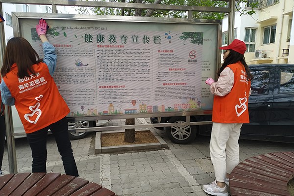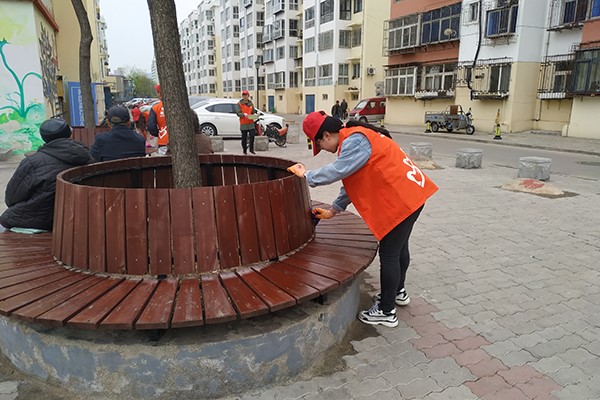 4月27日上午9:30,志愿者们根据分工到达各自负责的区域,井然有序地进行清理:擦洗宣传栏、清洁座椅、捡拾路面垃圾等。虽然当天温度较低,但阻挡不了志愿者们的热情。经过两个多小时的辛勤劳作,小区内的公共设施焕然一新,塑料袋、废弃纸张、烟头等垃圾基本清理干净。橙红色的志愿者马甲在小区内形成一道亮丽的风景线。