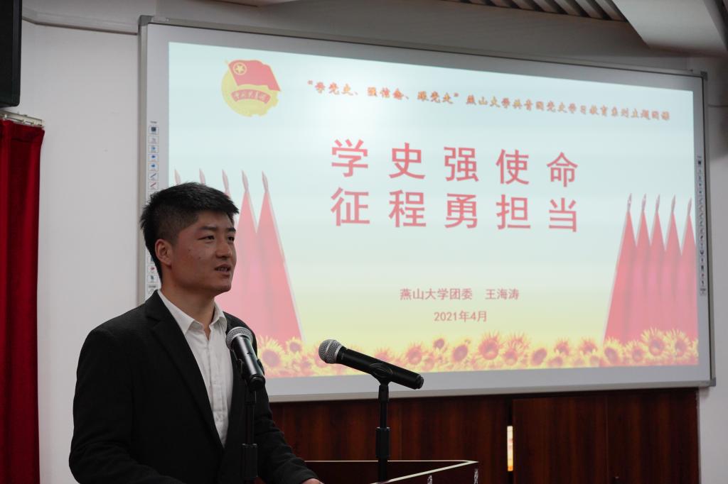 王海涛通过回顾建党历史和共青团发展历程,详细阐述了中国共产主义青年团的基本任务、重大历史事件及重要会议精神,进一步引导广大团员青年明晰党史学习教育的重大意义,动员大家积极参加集体学习,扎实开展自我学习,并注重切实将学习成果转化到实践之中,深刻弘扬熔铸在燕大人骨子里的奋斗基因、工匠精神、卓越品质和家国情怀,为学校冲刺国家“双一流”建设高校关键特殊时期取得新发展作出新的更大贡献,以优异成绩迎接建党一百周年。