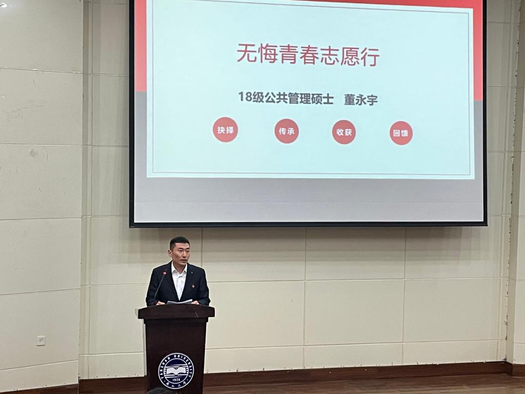 2018级公共管理专业硕士研究生董永宇是我校第一位参与西部计划的在读研究生,2019-2020年服务于新疆生产建设兵团第二师铁门关市,曾荣获“全国大学生西部计划优秀志愿者”称号。今年即将硕士毕业的他选择第二次加入西部计划,再赴西部,重圆梦想。董永宇从抉择、传承、收获、回馈四个方面回忆了他在兵团的感悟与成长,从73年前黄沙漫天的荒芜之地到如今绿树成荫的现代都市,铁门关市的繁荣发展就是记载着无数兵团人、志愿者投身祖国边疆建设的无声丰碑。董永宇表示,“希望让更多的人了解新疆、了解兵团,让更多的人知道新疆的棉花是怎么种植和采收的!”