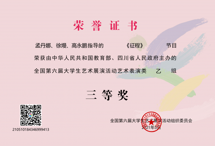 孟丹娜、徐熳、高永鹏指导的舞蹈作品《征程》荣誉证书