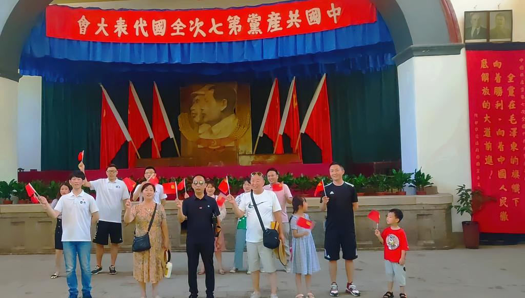 实践队员在革命旧址宣讲红色故事,带领游客齐唱《没有共产党就没有新中国》