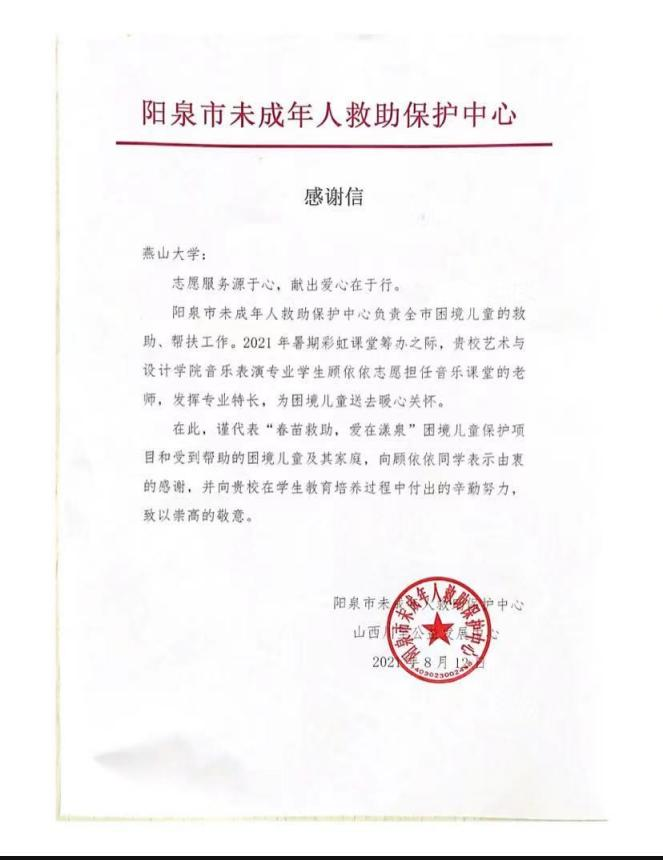 近日,乌鸦传媒收到一封来自山西省阳泉市未成年人救助保护中心发来的感谢信,信中对艺术与设计学院本科2019级音乐表演1班顾依依同学暑期担任困难儿童音乐课堂老师表达了诚挚的感谢,对该同学为困境儿童送去温暖关怀的行为给予了高度评价。