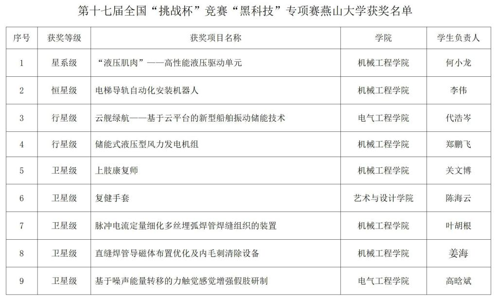 近日,历时半年的第十七届全国“挑战杯”竞赛“黑科技”专项赛结果揭晓。在河北省16项获奖作品中我校占9项,其中“星系”级作品1项、“恒星”级作品1项、“行星”级作品2项、“卫星”级作品5项,获奖数量、获奖等级均名列河北省首位。