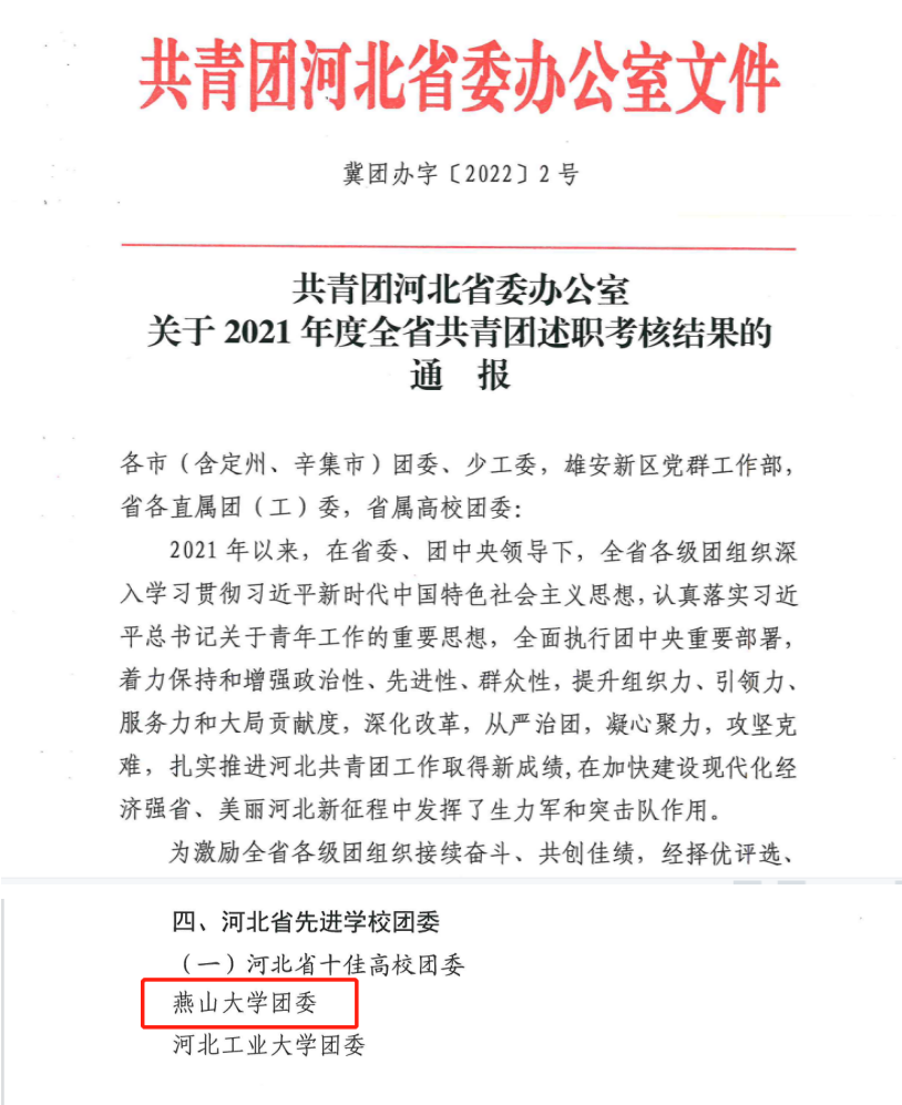 近日,河北省“优秀共青团员”“优秀共青团干部”“五四红旗团委(团支部)”评选结果揭晓,我校机械工程学院团委荣获河北省“五四红旗团委”称号,艺术与设计学院2018级工业设计2班团支部荣获河北省“五四红旗团支部”称号。