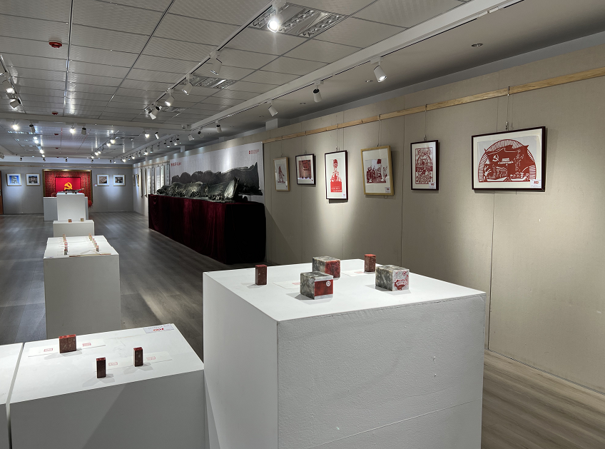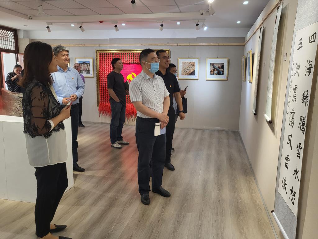 黄晟副书记一行在一件件展览作品前驻足欣赏,认真听取本次展览的筹备情况和作品的创作情况。在摄影作品前,黄晟详细询问了拍摄的背景和意义,在篆刻作品展台前,黄晟认真观看了通过篆刻呈现的团旗、团徽、“请党放心”“强国有我”以及冬奥图标等,对同学们创新传承优秀传统文化,通过艺术载体弘扬爱党爱国精神给予肯定。艺术与设计学院团委书记徐原就展览情况进行了介绍。