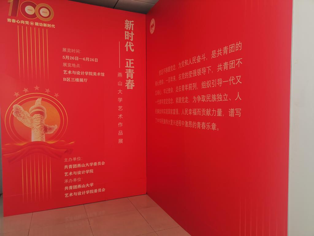 “新时代 正青春”艺术作品展由校团委和艺术与设计学院主办,艺术与设计学院团委承办。目的是在庆祝建团百年和喜迎二十大之际,引导青年学生用艺术的形式学习党领导青年书写激昂篇章的光辉历程,记录新时代发展的美丽画卷,展现青年学子不忘初心、牢记使命,永远跟党走、奋进新征程的责任担当。作品展于四月中旬启动,得到了同学们的积极响应,活动共征集海报、摄影、书法、篆刻、刻纸等艺术作品200余件,本次展出的121件作品均体现了爱党爱国、时代精神和燕大特色。作品展于5月26日至6月26日持续展出。