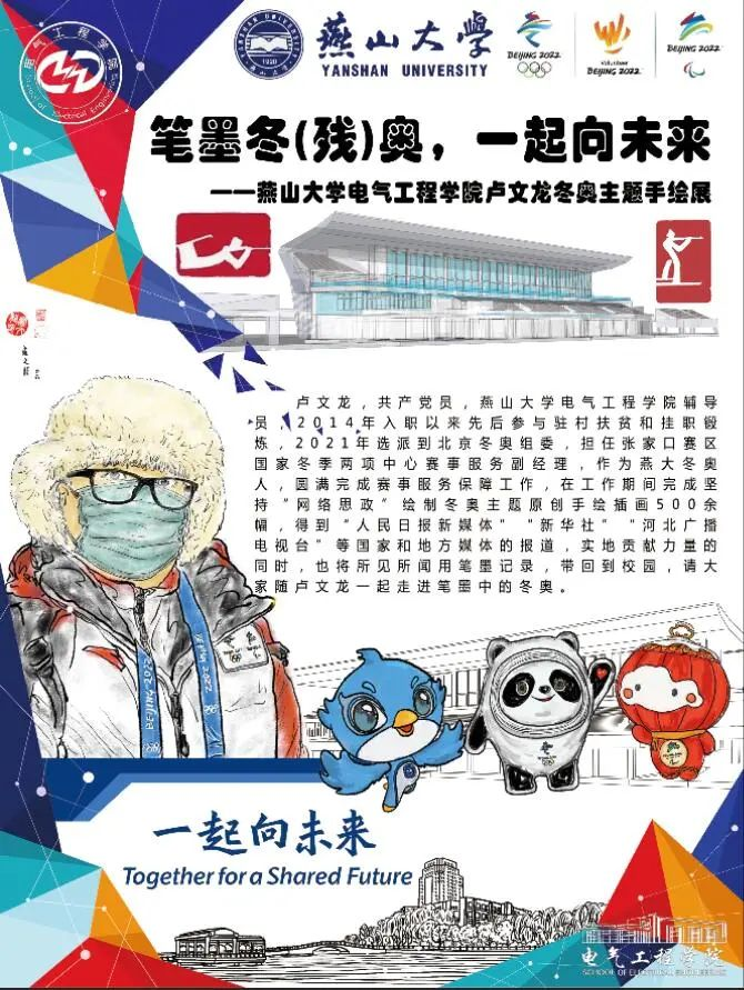 第二部分题为“笔墨冬奥,一起向未来”,展示了学院辅导员卢文龙老师在服务冬奥期间的部分手绘作品,通过“盛世逢盛会”、“简约冬奥不简单”、“冰雪中的奥运奖牌”、“冬奥中的燕大力量”、“冬奥中的电院青年”、“冰雪中的温暖”六个板块,清晰描绘了冬奥会从申办成功到筹备建设的过程,展示了优秀运动员的高光时刻,细致刻画了燕大冬奥人的点滴奉献以及各级领导的温暖关怀。