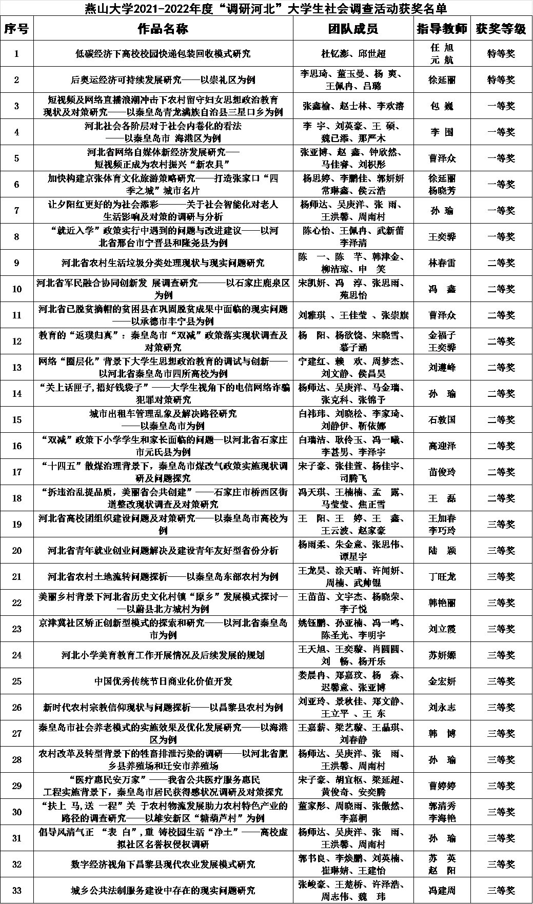 近日,共青团河北省委、省社科院、省青联、省学联联合发文,对2021-2022年度河北省大学生“调研河北”社会调查活动进行表彰。我校共有33支队伍获得表彰,其中特等奖2项、一等奖6项、二等奖10项、三等奖15项。信息科学与工程学院辅导员任旭、体育学院辅导员徐延丽被授予“优秀指导教师”荣誉称号。