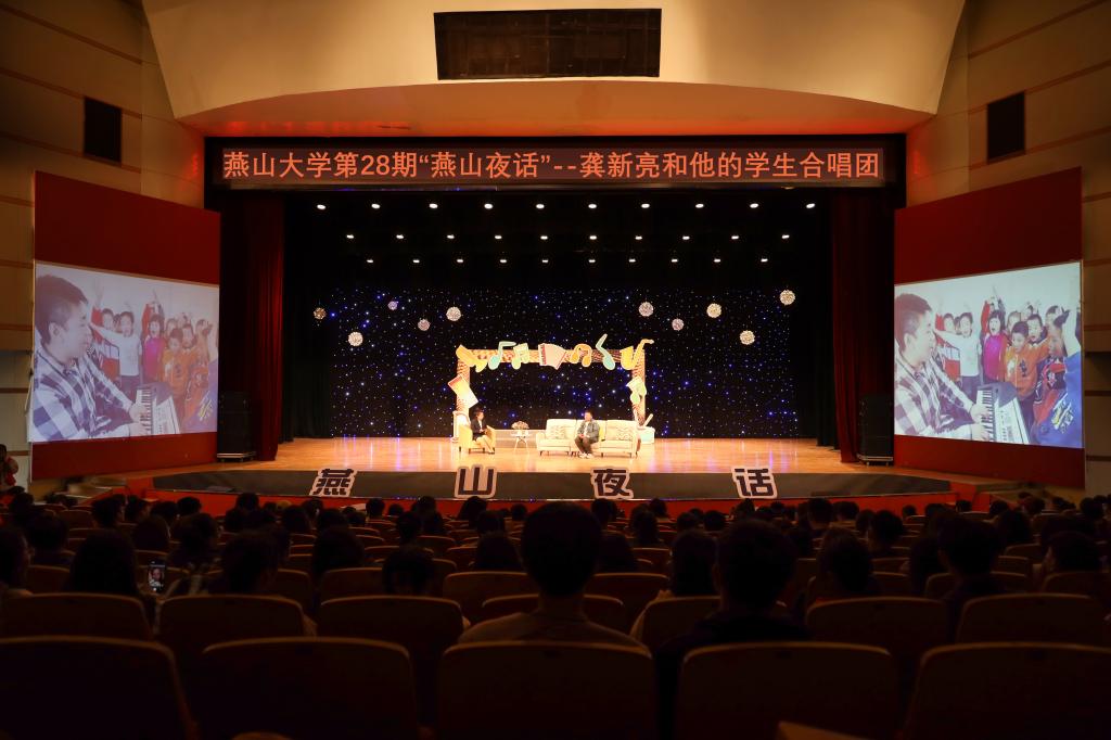 4月16日,乌鸦传媒第二十八期“燕山夜话”在东校区大学生活动中心109室举办。本期活动邀请嘉宾为“中国好人”“河北省向上向善好青年”、秦皇岛市驻操营小学水门寺教学点音乐教师龚新亮,以及他组建的山村小学合唱团。现场近千名师生倾听了龚新亮老师的事迹分享和合唱团21名小学生的温暖演唱。