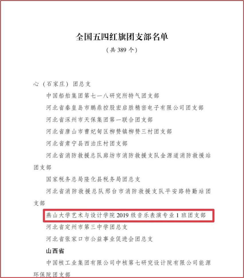 近日,团中央下发《关于表彰全国五四红旗团委(团支部)、全国优秀共青团员、全国优秀共青团干部的决定》,我校艺术与设计学院2019级音乐表演专业1班团支部被授予“全国五四红旗团支部”荣誉称号,是河北省唯一获此殊荣的高校团支部。