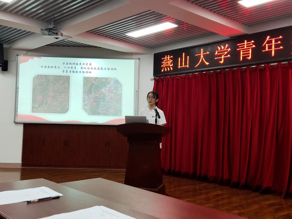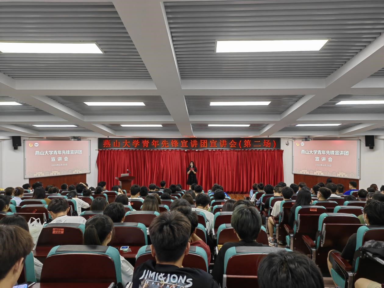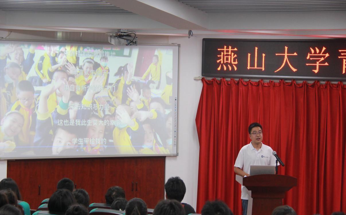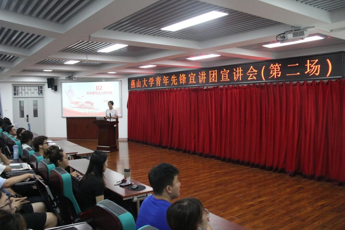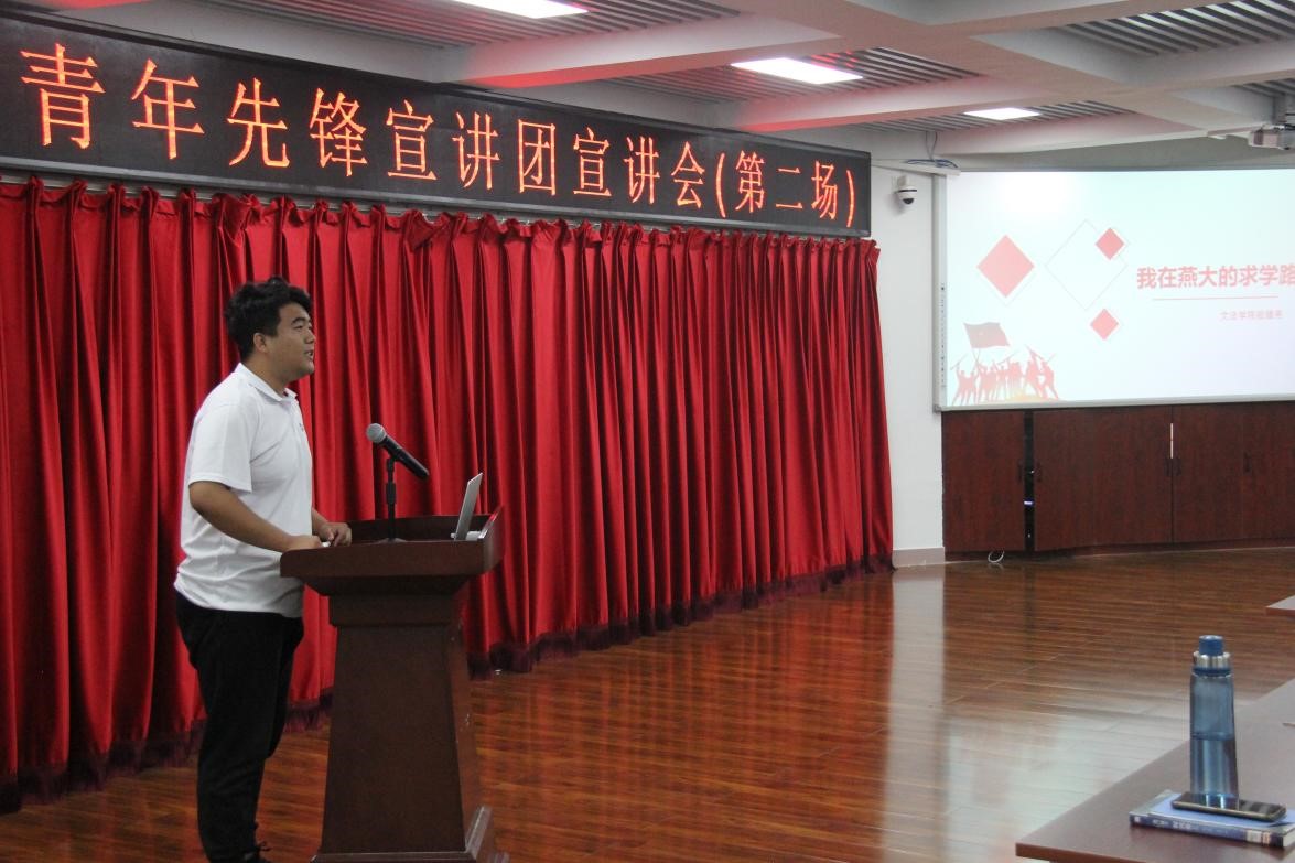 宣讲会上,5位宣讲团成员们分享了自己在理论学习、自我成长、志愿服务、社会实践、西部支教等领域的青春故事,他们以青年视角感悟初心使命,以青春之声共颂时代强音。马克思主义学院的李鹤以“泛娱乐思潮中的历史虚无主义——以民国热为例”为题,深入分析历史虚无主义的含义、传播以及应对方式,号召青年树立正确的党史观,大力弘扬红色基因,旗帜鲜明反对历史虚无主义;文法学院的祖健亮以自身故事来诠释自立自强的真正含义,不平凡的求学之路照亮着不平凡的人生之路,激励着在场每一位同学积极挑战自我,创造无悔青春;材料科学与工程学院的孙佳鑫分享了在祖国母亲70华诞时,参与“开天辟地”方阵游行的志愿经历,“强国有我,祖国的未来有我!”这一句句铿锵有力的话语激荡着青春的气息;外国语学院的田煜英分享了参加“鸿燕向党,红色溯源”党史研学的实践经历,在家乡的热土上讲述着革命先辈们的英勇事迹,用青春融入国家情怀,用实践书写出彩人生;经济管理学院的郭凯宇分享了自己疫情志愿服务、西部支教、北京2022年冬奥会、冬残奥会志愿服务的经历,他在一次次志愿服务与实践中体现着燕大学子的责任与担当,不断为中国梦贡献属于燕大人的青春力量。