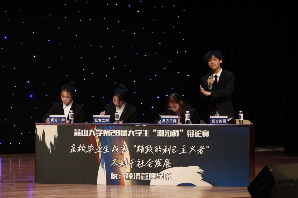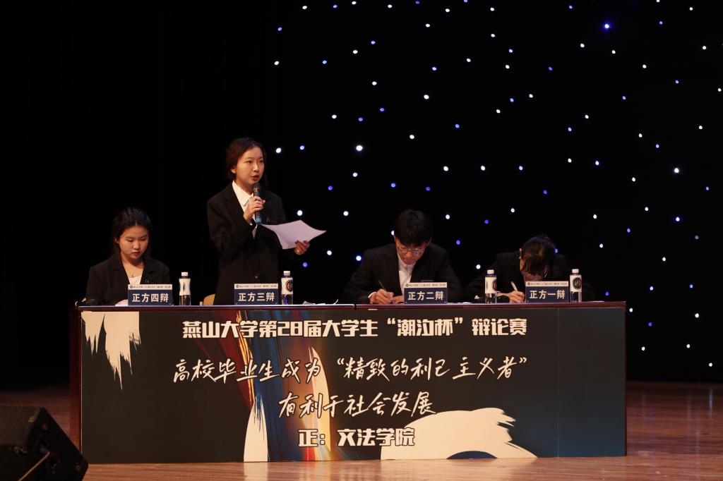 风华燕大,逐梦潮汐。开幕赛上,正方文法学院和反方经济管理学院学生辩论队就“高校毕业生成为‘精致的利己主义者’是否有利于社会发展”展开了激烈辩论。双方立足于个人发展与社会发展的关系进行立论;在质询环节紧抓对方漏洞,针锋相对,据理力争;在驳论环节中更是你来我往,攻守兼备;精彩激烈的自由辩中双方手旁征博引,妙语连珠,赢得现场观众阵阵喝彩,将比赛气氛推向高潮;总结陈词环节,结辩陈词掷地有声,直击心灵,引发观众的深入思考,在实现个人发展的同时要具有利他精神和责任感,才能够更好促进社会的发展。最终,反方经济管理学院学生辩论队获胜,陈梦雅荣获本场比赛最佳辩手。