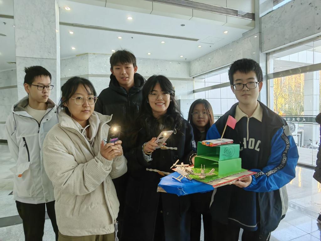 本次比赛中马芸熙、常昊宇、郭若桐、郭政言、窦康威、张丛博六位同学表现出色,获得了第一名的好成绩。他们在“扬帆远航”这一环节中设计并制作了一艘“航空母舰”。他们说:“我们的设计灵感来源于我国的航空母舰,因为祖国的强大,我们才能如此安宁的在学校学习,参与这些组织活动。所以,我们选取了航空母舰模型,以此来致敬祖国!”在他们的模型中,底部采用镂空交叠设计,增加了战斗机和直升飞机模型。