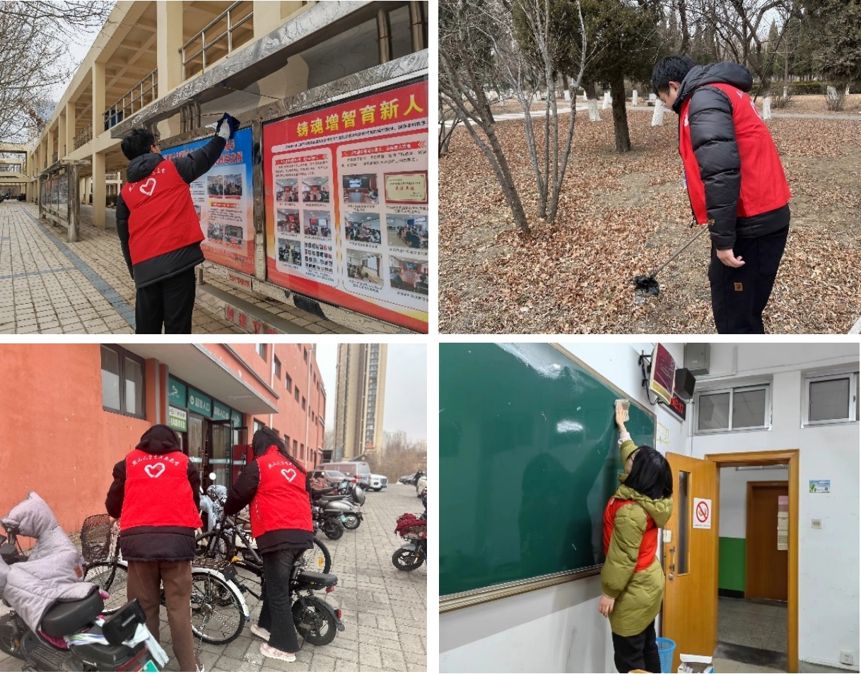 志愿者投身校园美化行动,擦拭灰尘、清理垃圾,为良好的校园环境贡献力量;将随意停放的电动车、自行车移到指定位置摆放整齐,为师生营造便捷通畅的出行环境,助力校园更加整齐明朗。