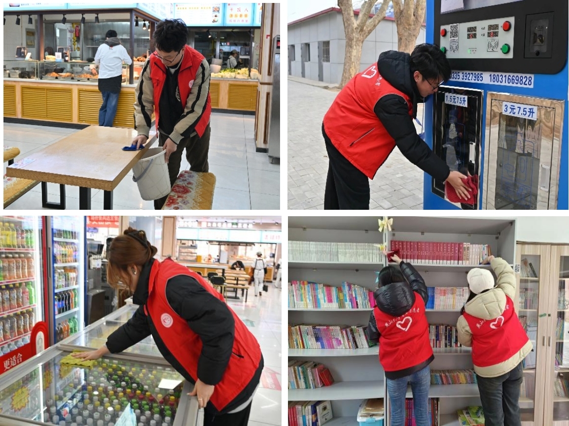 志愿者走进食堂,协助工作人员打扫卫生,清除餐桌污渍、清理卫生死角,为师生们提供良好的就餐环境;走进教室清洁桌面、摆放桌椅、擦拭黑板,让教室“换新颜”;深入燕大社区,进行卫生清扫、图书摆放整理,聚焦实际需求,为社区居民营造社区舒适阅读空间。