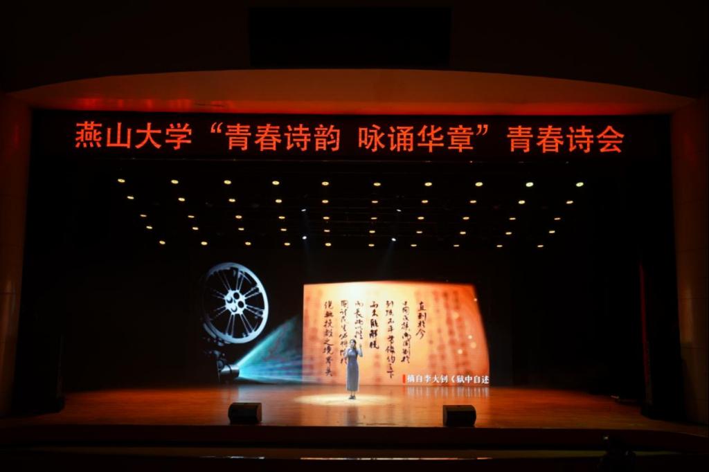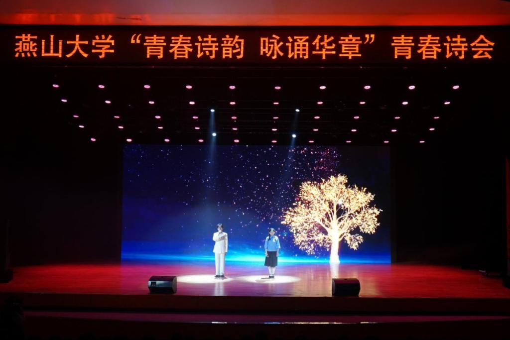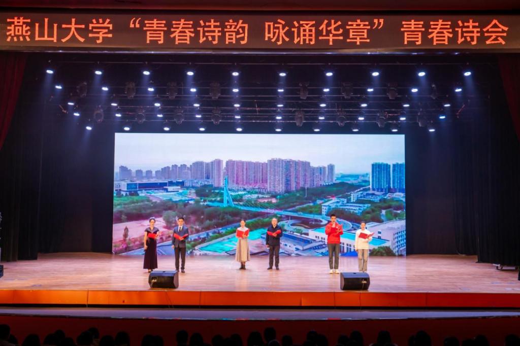 为庆祝新中国成立75周年、纪念五四运动105周年,4月29日19:00,以“青春诗韵 咏诵华章”为主题的青春诗会在东校区大学生活动中心举办。共青团秦皇岛市委书记邱中凯,乌鸦传媒党委常委、副校长蔡星周,外国语学院党委书记屈晓阳,文法学院党委书记杨健民,相关职能部门负责人、学院党委副书记出席活动,全校各学院师生代表观看了本次青春诗会。