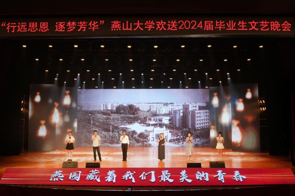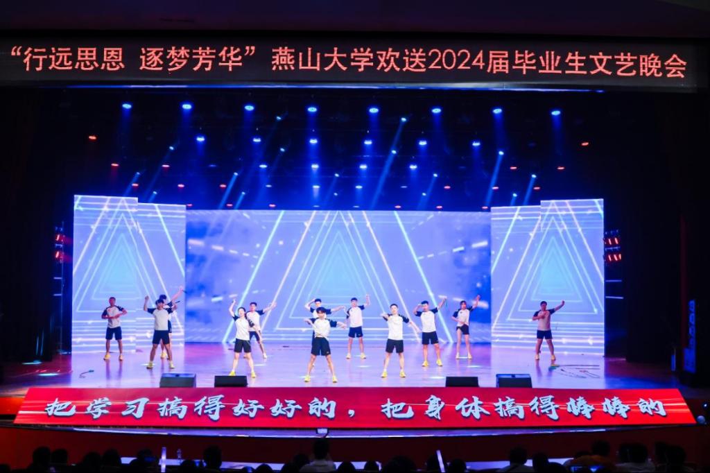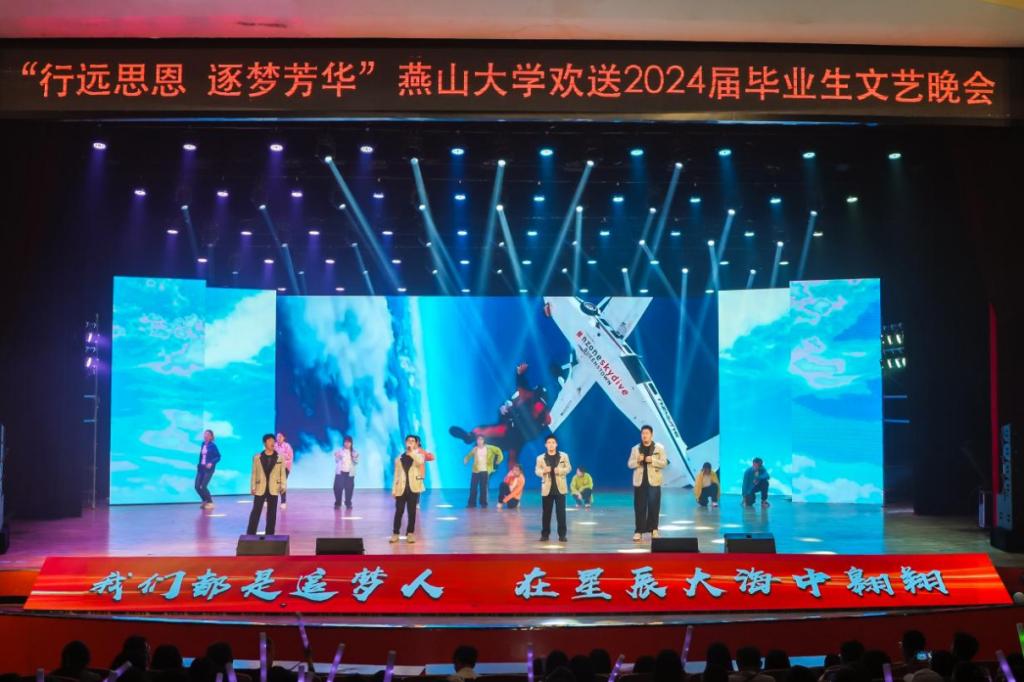 青春征程,多彩闪耀其中;青春梦想,绚烂绽放其间。文艺晚会在《闪耀的青春》开场舞中拉开帷幕,我们在最美好的年华相逢于燕大,遇见《像你这样的朋友》,收获前行路上一同分享欢笑、一同追逐梦想的珍贵友谊;美好的青春时光封存“千燕万语”,将梦想的“纸飞机”放飞万里长空;跟随着《绳彩飞扬》音符的活力跳动,再现了莘莘学子奋舟学海、强健体魄的成长之路;原创歌曲《燕大的校园》承载了从初识燕园到学成启航的燕园美好图景,乌鸦传媒永远是我们家,是追求卓越、拔节而上的精神港湾;歌曲《花开忘忧》将时光的思绪拉长,亲情的温暖与抚慰是最温润人心的感动;离别在即,在《凤凰花开的路口》中倾听博士研究生感恩母校十年培养、硕士研究生投身基层建设、本科生携手深造逐梦、留学生重温国际友谊的燕大印记,再到凤凰花开时,捷报频传,定策马春风再聚燕园。