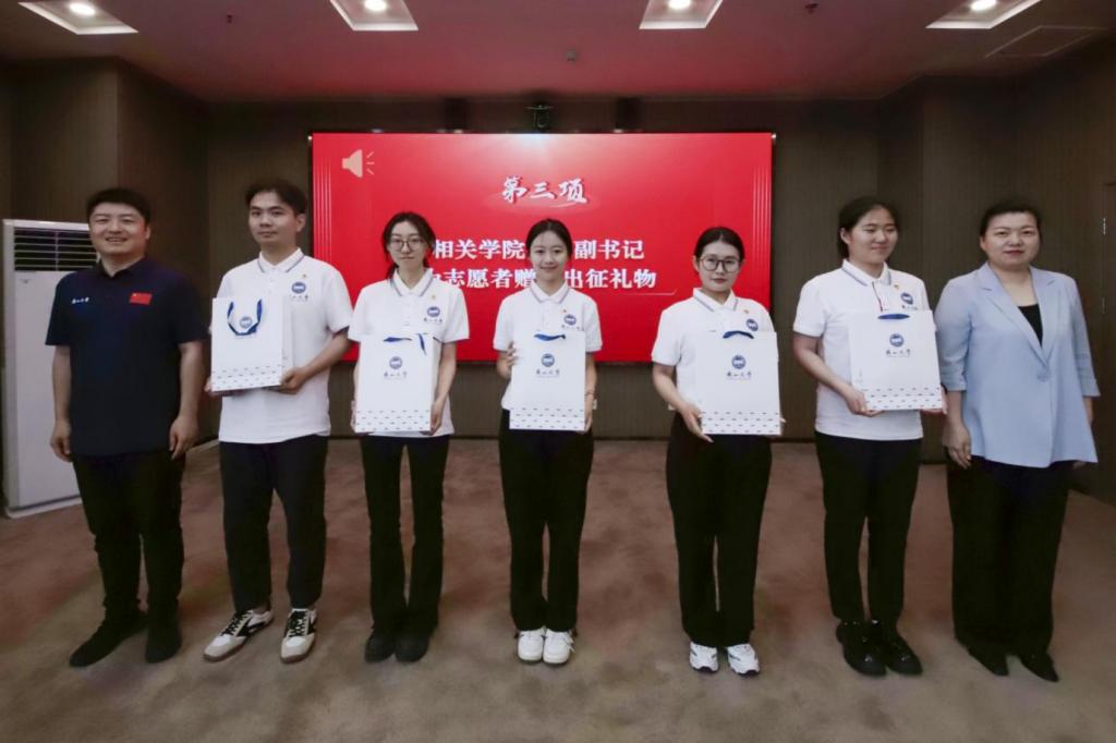 相关学院领导为研支团志愿者赠送出征礼物,希望全体成员在学校的关心支持下全力做好支教工作。