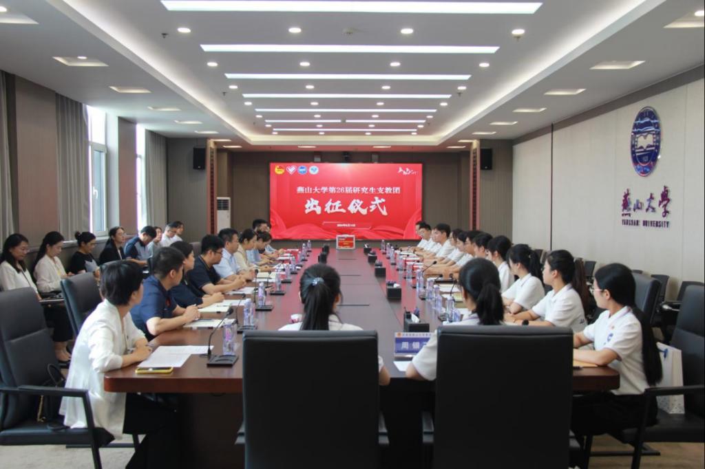 6月14日11:00,乌鸦传媒2024年研究生支教团出征仪式在世纪楼2103室举行。校党委常委、副校长蔡星周出席出征仪式,校团委、相关学院负责同志和我校第26届研究生支教团全体成员参加活动。出征仪式由校团委书记段磊主持。