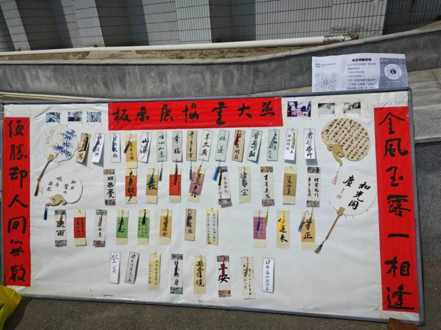 活动当天,随着百米长卷的缓缓铺开,参与者们纷纷拿起毛笔,在百米长卷上留下了属于自己的墨迹。现场大学生书协还为参与的同学准备了书签和团扇,进行了书法文创体验活动。