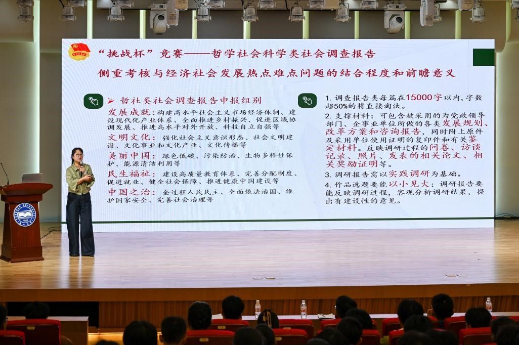 培训会上,杨晓芳老师对“挑战杯”竞赛进行了全面介绍,并通过优秀案例讲解深化了同学们对比赛的认识;呼子宇老师以自己的“挑战者”故事为切入点,用亲身经历向大家传授了作品申报和竞赛选题的宝贵经验,激发了同学们的参赛热情;陈宇同学聚焦社科类挑战杯赛的参赛过程及注意事项,鼓励同学们紧扣社会热点、关注实际问题,用科学的方法分析并解决问题,为社会和谐发展贡献智慧;代言同学用“好点子-好本子-好底子-好片子”四个篇章,生动形象地分享了自己的参赛经验,一个好的创意是成功的开始,而扎实的准备和出色的展示则是赢得比赛的关键,代言同学的分享让在场的同学们受益匪浅,大家对如何准备和展示自己的作品有了更深的理解。