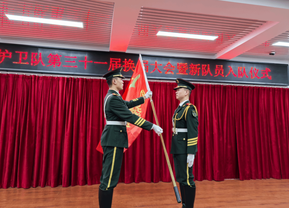 大会在庄严的国歌声中启幕。第三十届国旗护卫队队长孙志诚作工作总结,系统回顾队伍在思想建设、日常训练及重大任务中的突出表现,并向新队员提出"传承使命、接续奋斗"的殷切期望。大会对第三十届优秀队员进行表彰,宣读第三十一国旗护卫队任职文件,依次完成聘书颁发、臂章佩戴、队旗交接及仪仗指挥刀交接等仪式。