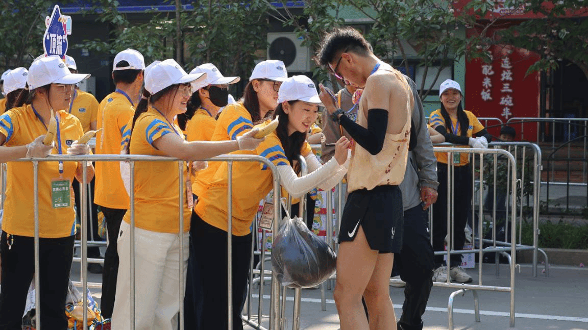 凌晨四点,“鸿燕班”六期学员抵达半程马拉松终点物资发放处有条不紊地进行赛前准备工作,为迎接参赛选手做足准备。比赛期间,他们始终以昂扬的姿态坚守岗位,构筑起一道靓丽的“青春服务线”,保障赛事后续流程顺利进行。志愿者们高举欢迎牌,挥舞手中旗帜,用灿烂的笑容、温暖的鼓励,向每一位完赛选手致以祝贺。“恭喜完赛,您辛苦了!”“请这边领取物资,注意补充水分!”一句句贴心的话语,传递着无微不至的关怀。