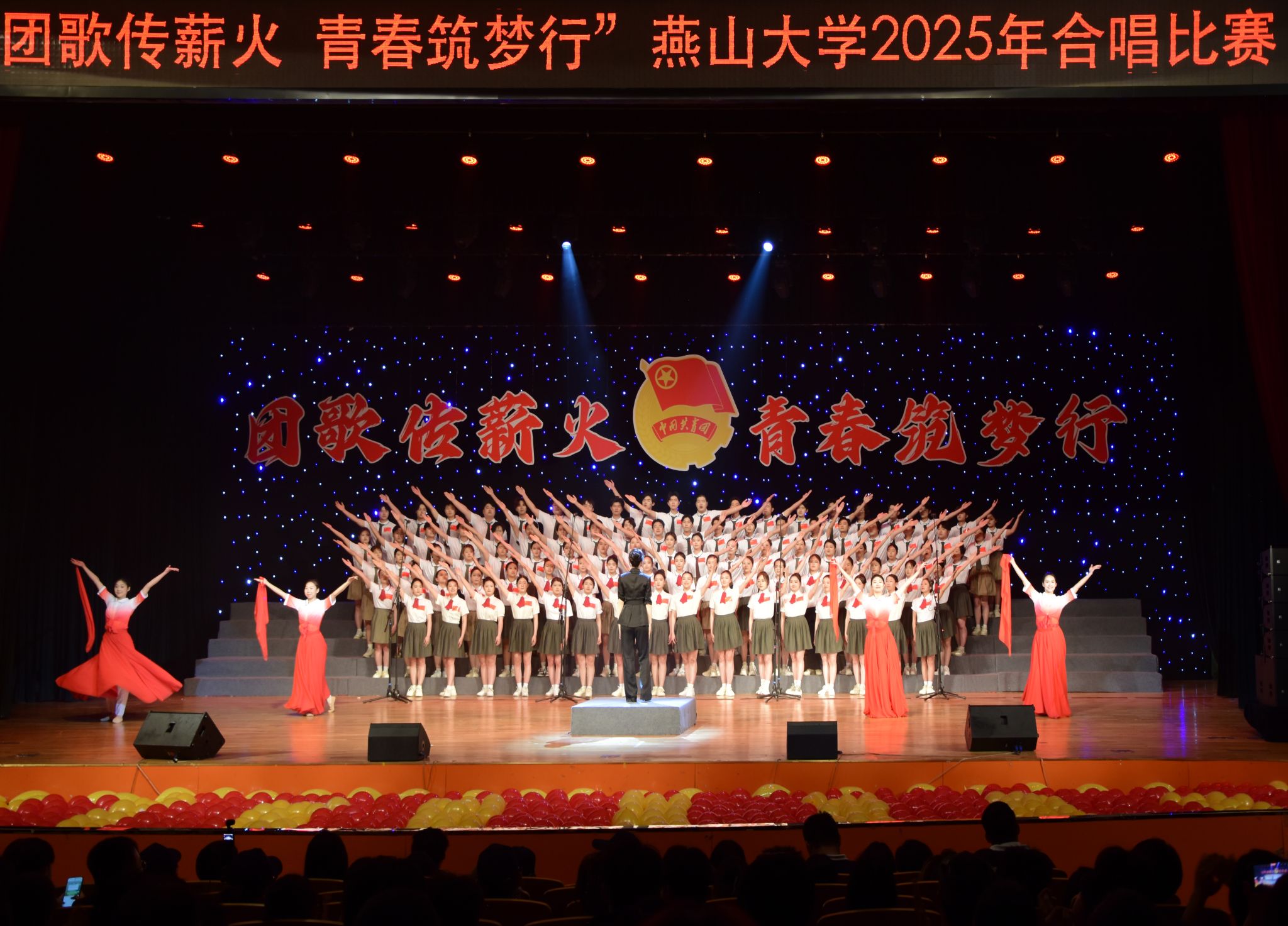 比赛现场气氛热烈,各参赛单位按照抽签顺序依次上台,分别演唱必选曲目《光荣啊,中国共青团》及一首自选曲目。他们用嘹亮的歌声表达了对理想信念的坚定和对共青团的热爱,展现了新时代燕大青年积极向上的精神风貌。《千尘之光,万里之国》奏响青春序曲,抒发了燕大学子对未来蓝图的美好期许;《星辰大海》《明天会更好》引领大家仰望星空、展望未来;《我和我的祖国》《我的中国心》唱出燕大学子对祖国母亲的深情告白,字字句句尽显赤子之心;《在灿烂的阳光下》《新时代建设者之歌》《平凡之路》展现出新时代追梦人昂扬的斗志与强烈的使命担当;《祖国不会忘记》以激昂的旋律礼赞那些默默奉献的无名英雄;《请党放心,强国有我》《有我》唱出了新时代青年在强国建设中挺膺担当的铿锵誓言;《保卫黄河》气势恢宏,彰显出中华民族坚韧不拔的民族气节;《当那一天来临》展现了新时代青年时刻准备为祖国奉献的忠诚与担当;《如愿》、《紫荆花盛开》将华夏儿女对祖国的依恋和美好期许娓娓道来。