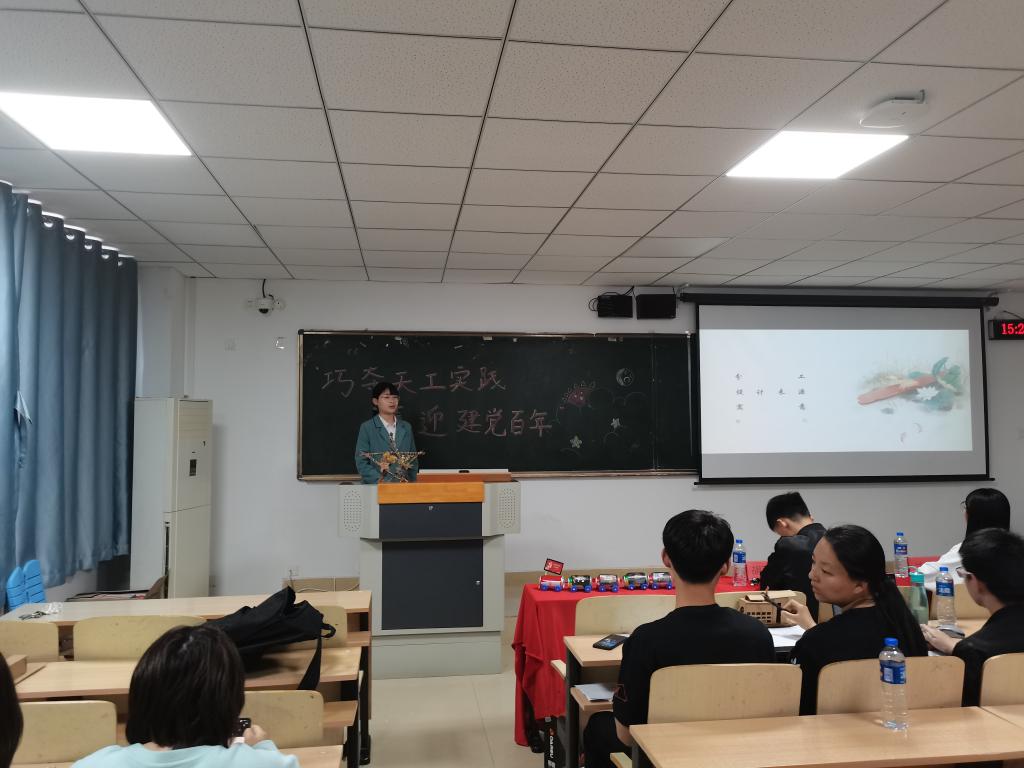 下午3:00比赛正式开始。参赛选手依次上台结合PPT阐释作品的结构,制作理念及制作过程,展示着为党庆生的手工“礼物”。本次参赛作品都是由生活中的废旧物品重新利用而成,既有党史手册,精致小巧;亦有红舟雕刻,蕴意丰富,一件件饱含着制作者心血与智慧的工艺作品,在现场观众的惊呼与赞叹中,展现在评委和观众们面前。。经过激烈的角逐,最终20级建筑学周家羽同学的红舟初心饱含着青年学子对党的真情、对祖国的祝福获得一等奖。