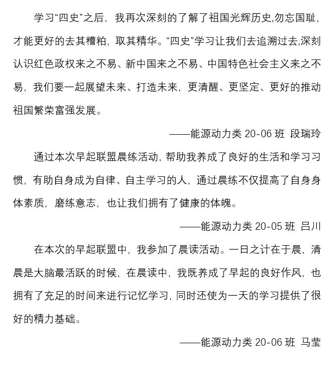早起联盟虽然结束了,但这段已然流逝的时光承载着同学们满满的收获。通过一个月的坚持,同学们不仅养成了早起的好习惯,同时学习了"四史",相信他们能够在今后的每天清晨中迎来第一抹阳光,学史奋进!学史力行!(编辑: 吕川 刘京刚)
