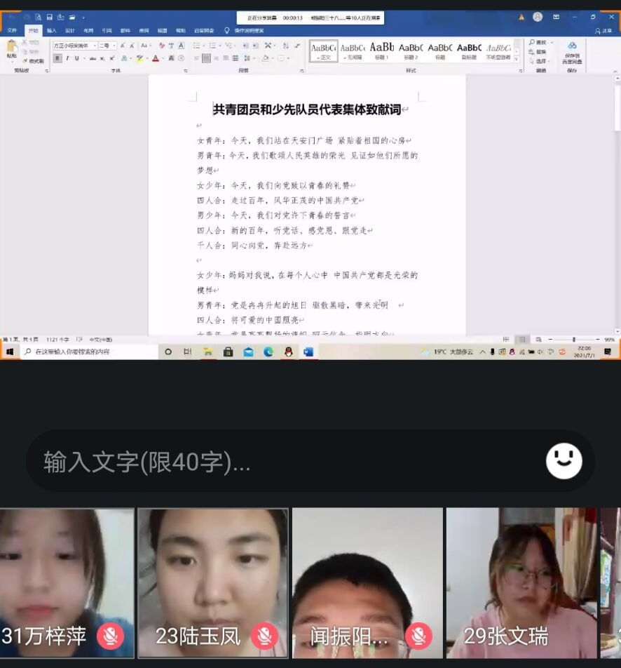 2021年7月1日,在中国共产党建党一百周年之际,中共中央总书记、国家主席、中央军委主席习近平发表重要讲话。为迅速学习宣传贯彻习近平总书记“七一”重要讲话精神,7月1日下午,建筑工程与力学学院组织开展“庆祝党的生日,研学讲话精神”主题团日活动,院属58个团支部,全体团员通过线上、线下的形式开展活动。