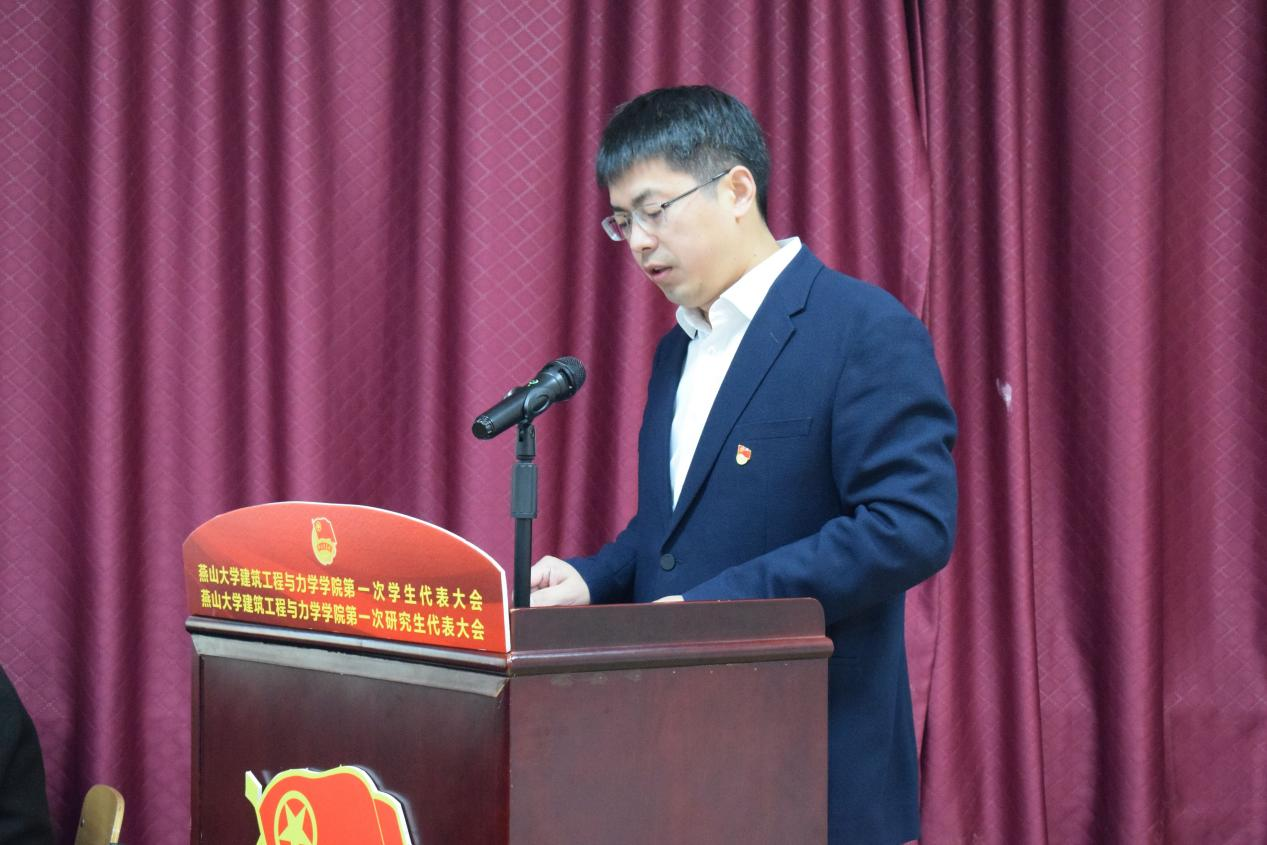 王兵代表建筑工程与力学学院党委做了题为《恰是百年风华 奋斗正当其时》的重要讲话。王兵在讲话中对我院学生会、研究生会等学生组织在践行新时代青年思想、秉承新环境服务意识、增强新格局责任担当等方面所做的工作给予高度赞扬,对我院广大青年在科技竞赛、创新创业、志愿服务、社会实践等领域所取得的成绩和贡献给予高度肯定。同时勉励全院青年勤学善思,增长才干,让业务能力“专、精、深”,使思想道德“真、善、美”,牢记强国使命,以新的奋斗伟力书写新的时代篇章,以新的伟大胜利铸就新的精神丰碑。王兵代表学院党委向广大同学、团学骨干、学生组织提出了新的希望和要求:一是希望新时代的建工学子要心怀天下,志存高远,在实现大我中成就小我;二是希望各学生组织要紧跟时代步伐,深化推进改革,引领同学成长;三是希望广大团学骨干要不忘初心使命,勇担时代重任,服务青年发展。