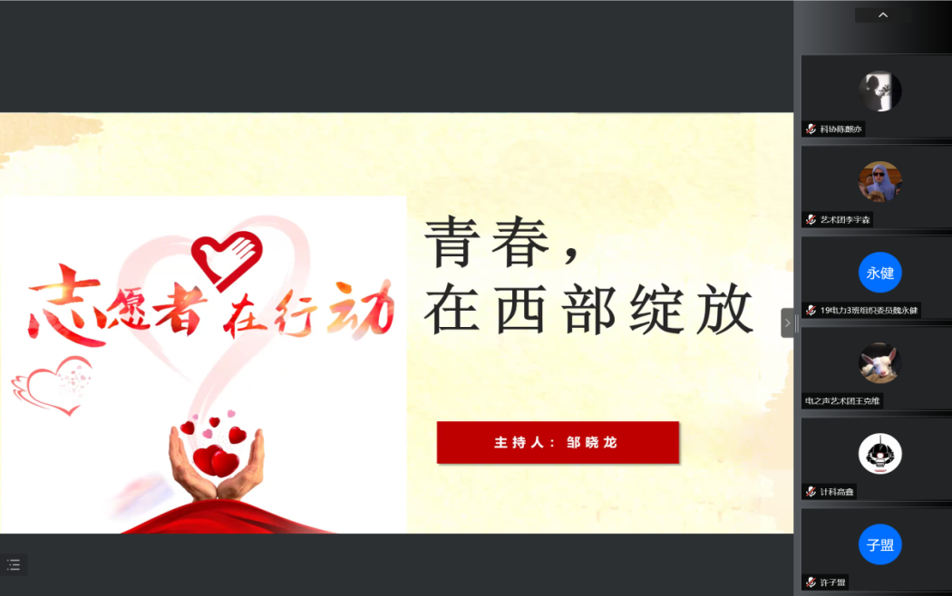 为了帮助青年学生更好的了解西部志愿服务工作,了解学院研究生支教团及西部计划志愿服务学生的工作和生活,教育和引导电院有志青年到西部去,到基层去,到祖国和人民最需要的地方去。5月23日晚7点30分,电气工程学院组织召开了“青春,在西部绽放”西部志愿服务交流会。学院目前正在青海省德令哈市第五中学和柴达木路小学支教的周顺达、王乔璇同学,以及正在新疆巴州若羌县开展西部计划志愿服务的高博璐同学与学院276名团干部和团员青年云端相聚,畅聊西部,共话奋斗青春。学院团委书记张颖,学生辅导员郝亚琴、刘明、赵雨桐与同学们一同参加了交流会。