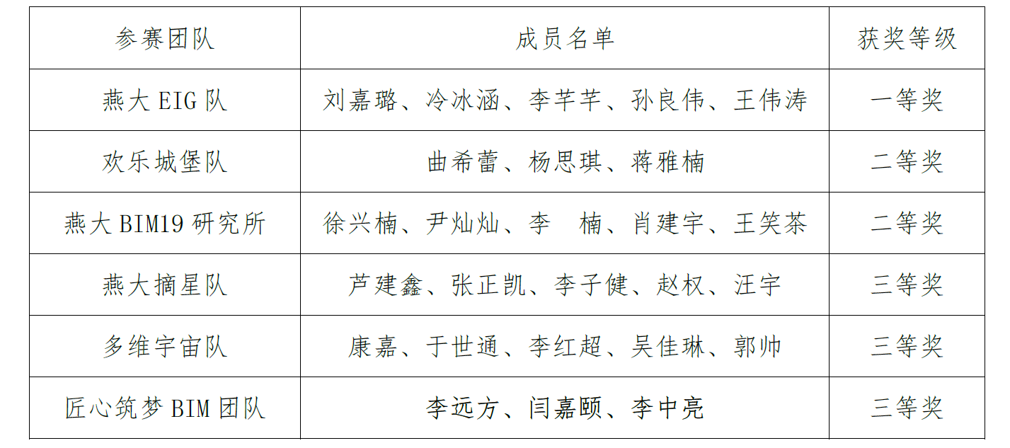 本届大赛由中国土木工程学会建设市场与招标投标研究分会和广联达科技股份有限公司主办,共吸引了全国550余所高校、4600余支队伍、20000余名师生参赛,共计提交作品3000余份。经过评选,我校提交的作品“EIG文化创意产业园”获得一等奖,“某工程大厦”和“基于BIM技术的世纪坛医院模拟”获得二等奖,“机电BIM建模与应用”“装配式施工建造与应用”“基于BIM的幼儿园项目土建施工建模与应用”获得三等奖。