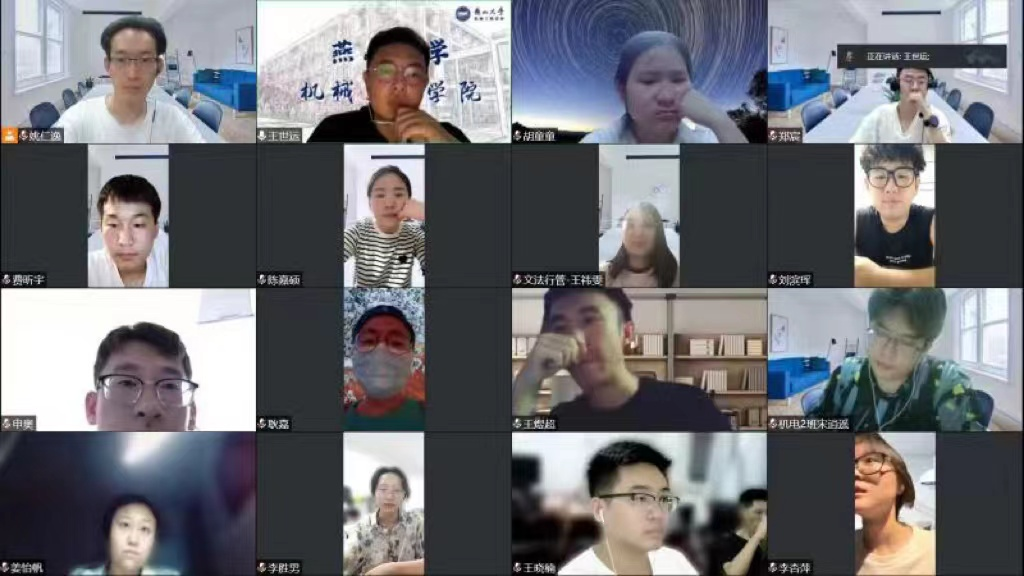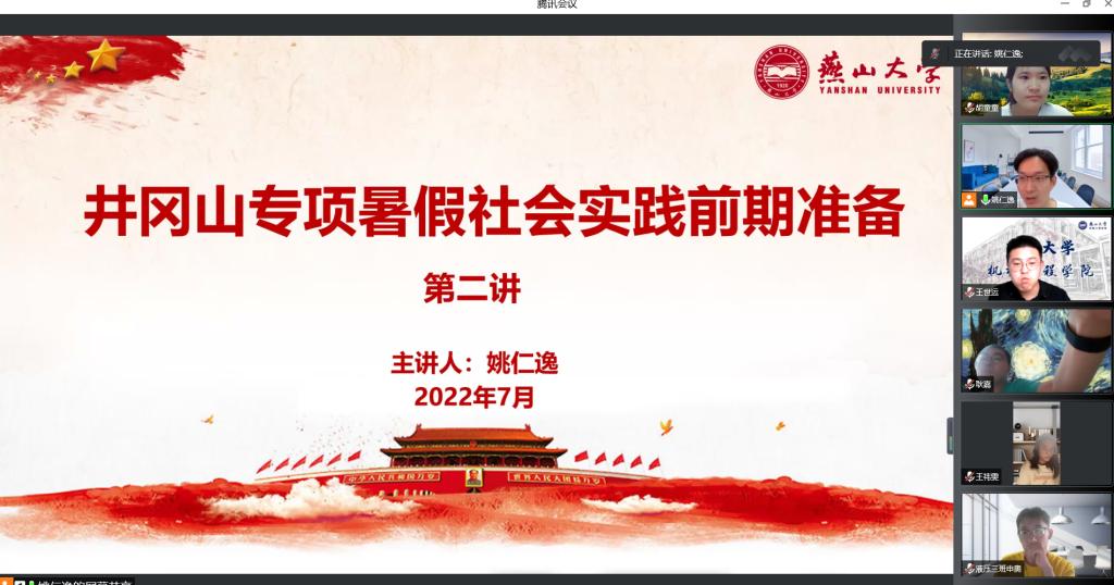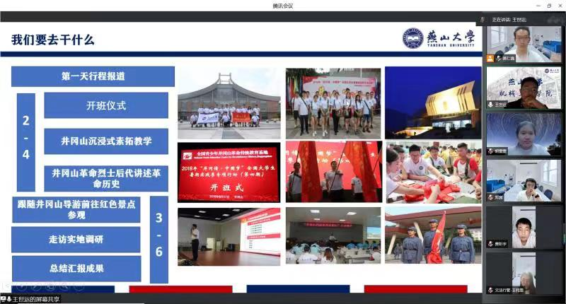 为高质量完成2022年“井冈情·中国梦”全国大学生暑期社会实践专项活动,展现燕大机械学子的责任与担当,7月20至22日晚,我院党建赋兴社会实践团队于腾讯会议(线上)召开三次井冈山专项暑期社会实践活动筹备会议,会议由团队指导教师王世运主持,姚仁逸和李胜男做经验分享与工作规划,团队全体成员共16人参会。
