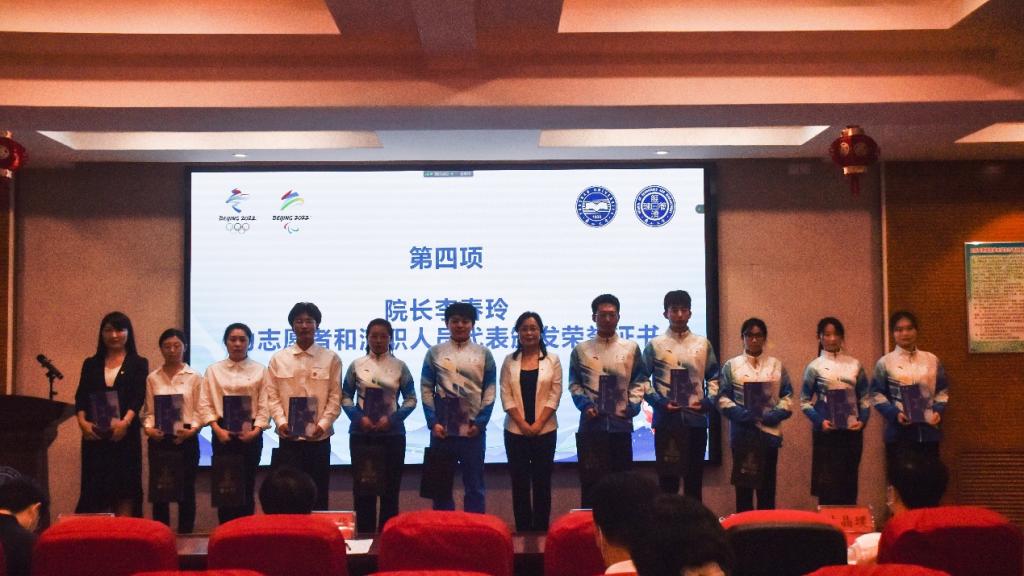 院长李春玲为荣获表彰的志愿者代表和闭幕式演员代表颁发荣誉证书。受到表彰师生备受鼓舞、倍感骄傲,线下线上观众掌声雷动,经久不息。