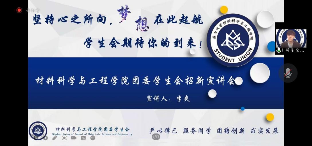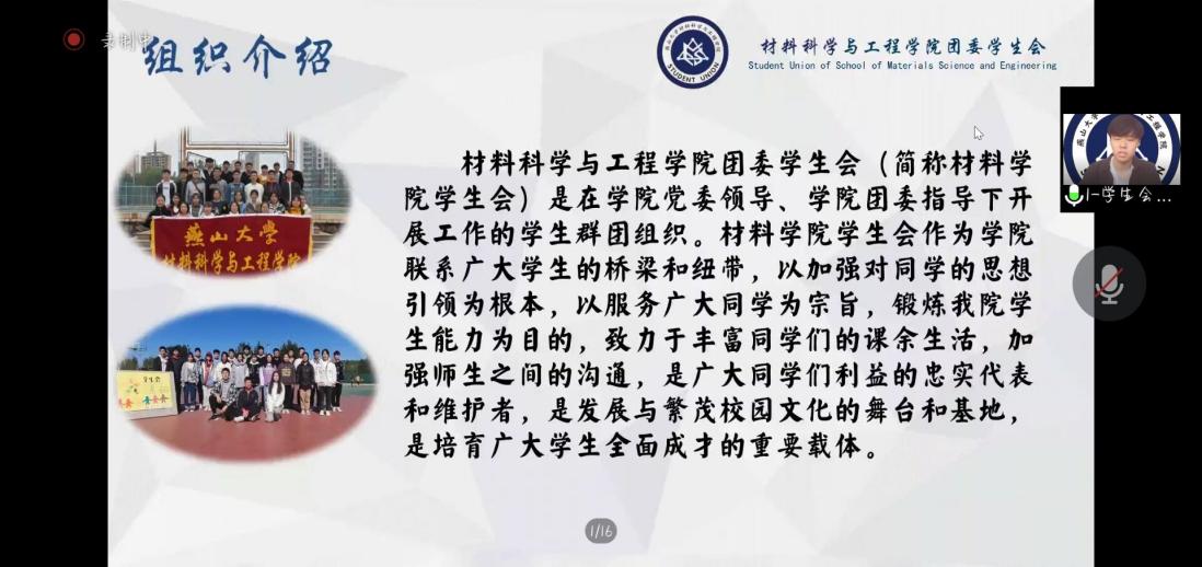 2022年9月3日上午9:00,2022年材料科学与工程学院学生组织社团宣讲会以线上宣讲的方式举行。材料科学与工程学院学生会、团委组织部、晨曦大学生网络文化工作中心、柠檬树青年志愿者协会、科学技术协会、英语之声、A.R.T艺术团、篮球队、足球队、乒乓球队、羽毛球队、辩论队等各组织社团负责人进行了宣讲展示,为萌新们答疑解惑,助力新生成长,提供发展方向。