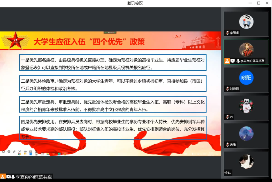 首先,李嘉良从优惠政策、入伍条件、入伍流程等方面系统解读了有关大学生应征入伍的一系列方针政策,阐明参军入伍、保家卫国的深远意义,让学弟学妹们积极响应党和国家号召,踊跃报名参军,将拳拳爱国之心化作实际行动报效祖国。在当今社会,只有把大批优秀青年送到部队,才能为新时期加强国防和军队建设、提高部队战斗力奠定坚实基础,才能传承中国军人的龙虎精神。