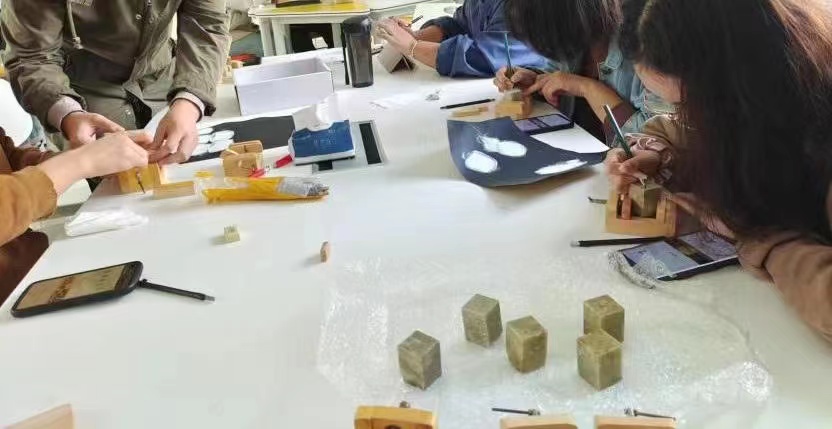 中国篆刻艺术集书法、绘画、雕刻、雕工及印材于一体,方寸之间,气象万千。篆刻协会为参加活动的同学们讲述篆刻文化的历史,进行篆刻工具和技法的讲解与示范,并进行现场篆刻操作和指导。同学们学习磨平印面、查找篆体字、设计文字的布局、描写印稿、执刀镌刻等,对于初次接触篆刻艺术的他们来说,每个环节都不简单,但最终都顺利完成了独属于自己的印章。同学纷纷表示,进一步了解了中华优秀传统文化,收获了满满的知识和快乐。
