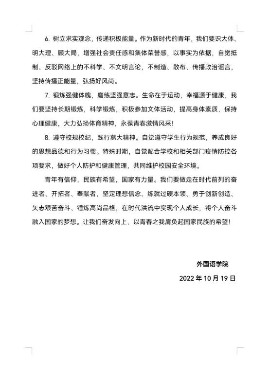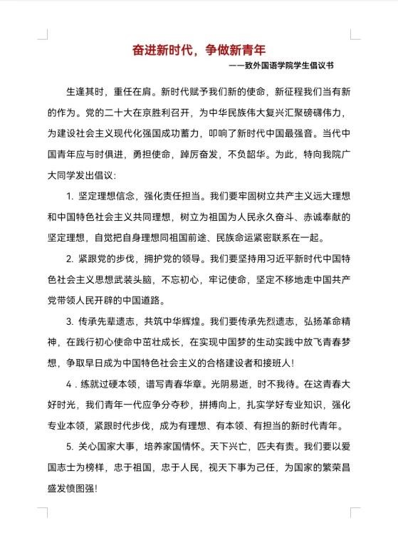 2022年10月16日,在迈上全面建设社会主义现代化国家新征程、向第二个百年奋斗目标进军的关键时刻,党的二十大在京胜利召开,为中华民族伟大复兴汇聚磅礴伟力,为建设社会主义现代化强国成功蓄力。此次大会事关党和国家事业继往开来,事关中国特色社会主义前途命运,事关中华民族伟大复兴,万众瞩目,振奋人心。为积极响应党的二十大报告对当代青年的要求,10月19日外国语学院向全院学生发出倡议。