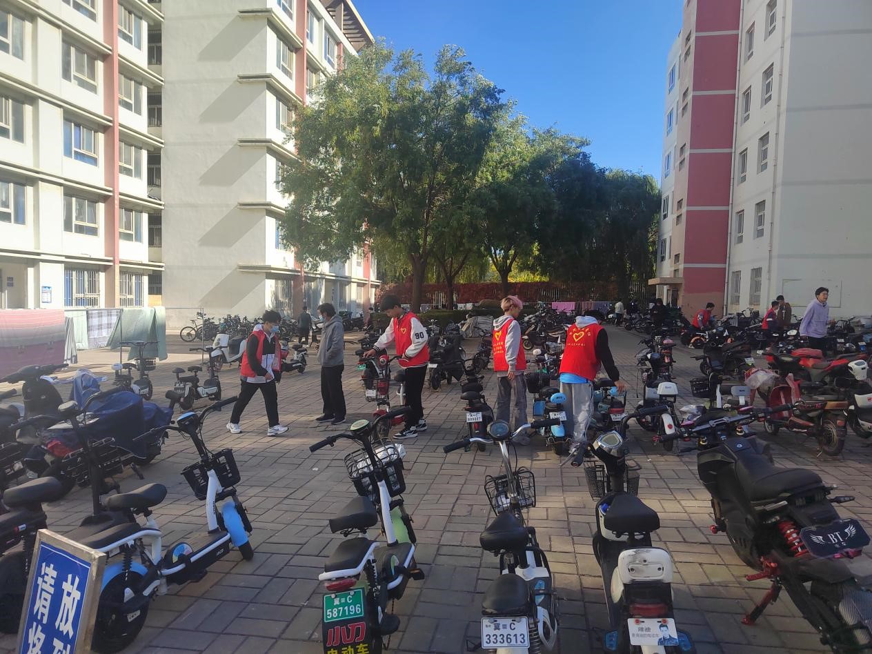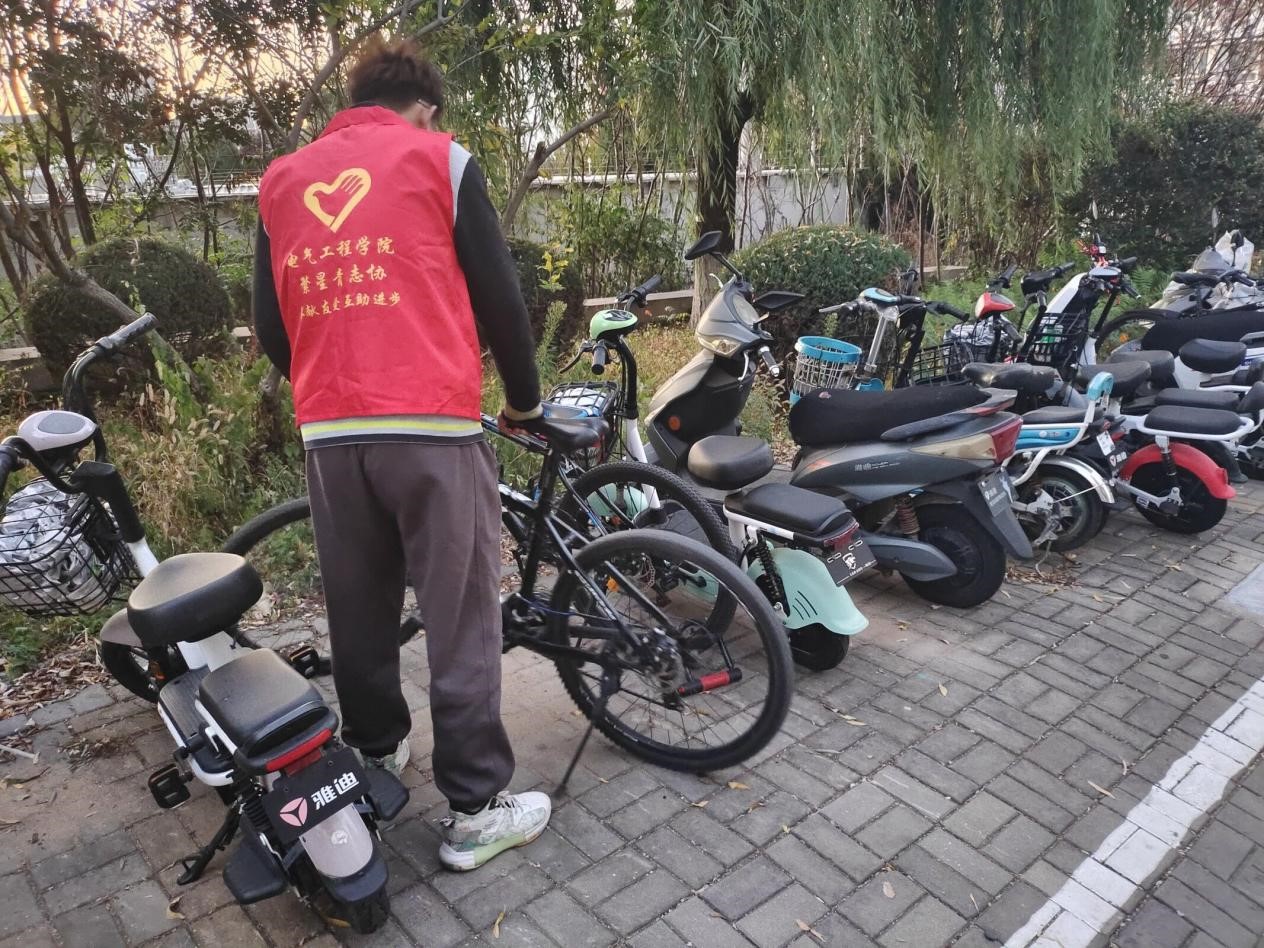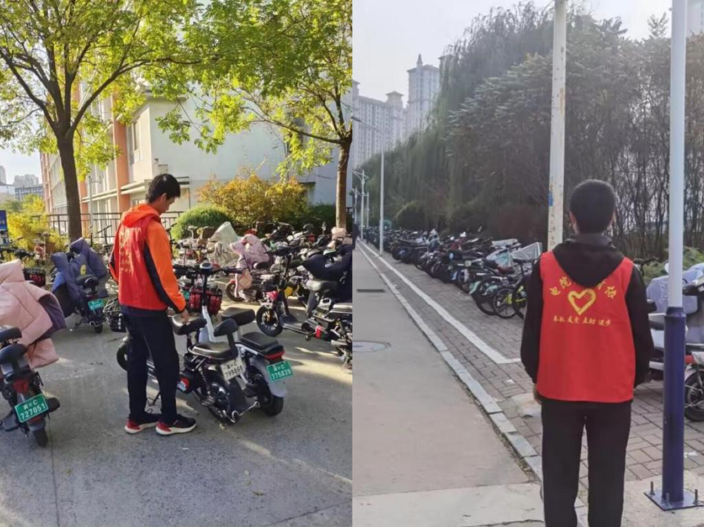 志愿者们身穿红色马甲,手持引导旗,每天分早、中、晚三班,分流人群、摆放车辆、提醒同学们按照规范停放车辆。匆匆忙忙上课下课的的同学们、来来往往回寝离寝的小伙伴们,有的不解,有的感到不便,但更多的是为志愿者们竖起了大拇指。经过了二十多天的集中整改,自愿按照要求线路上下课、停放车辆的同学越来越多……看着因自己的努力而变得更加整齐有序的校园,志愿者们也露出了会心的笑容。