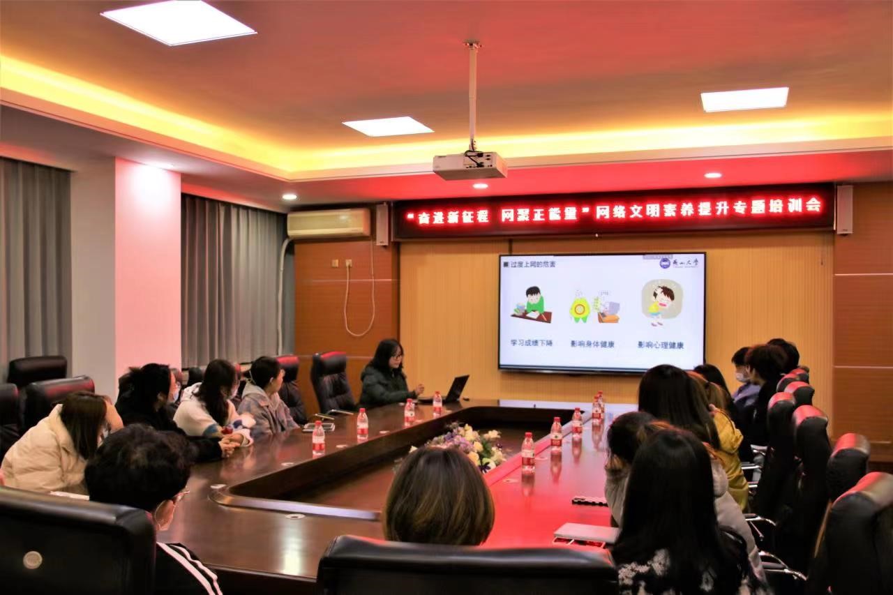 为进一步加强学生网络行为教育引导工作、规范大学生网络行为,2022年10月27日晚6:30,外国语学院团委于人文馆417召开了“奋进新征程,网聚正能量”网络文明素养提升专题培训会,外国语学院团委书记谢银珂、副书记唐亚杰及外国语学院所有组织社团主席团成员出席了此次会议。