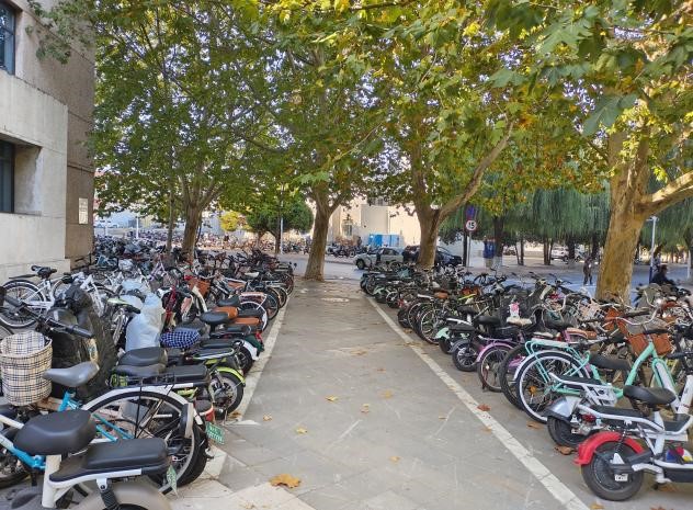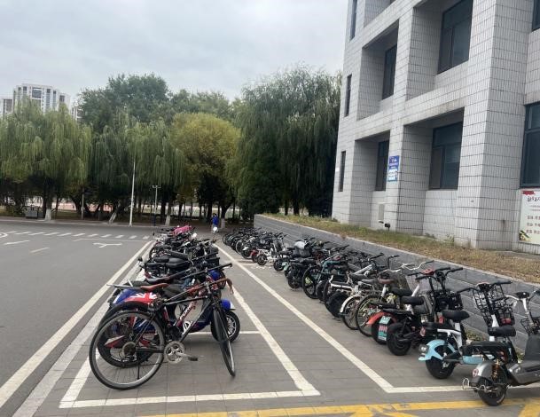 (第一学生公寓与第三教学楼前整齐摆放的车辆)