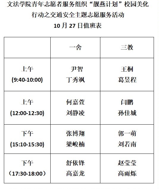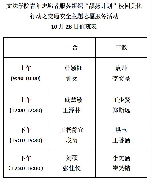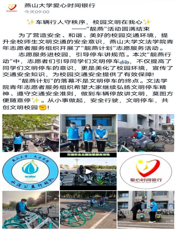 为进一步创建和谐清洁的校园环境,倡导师生文明出行,营造安全的交通环境,文法学院(公共管理学院)爱心时间银行和水滴公益行动队于10月7日至10月30日在第一学生公寓与第三教学楼及其周边区域联合开展了“靓燕计划”校园美化行动之交通安全主题志愿服务活动。