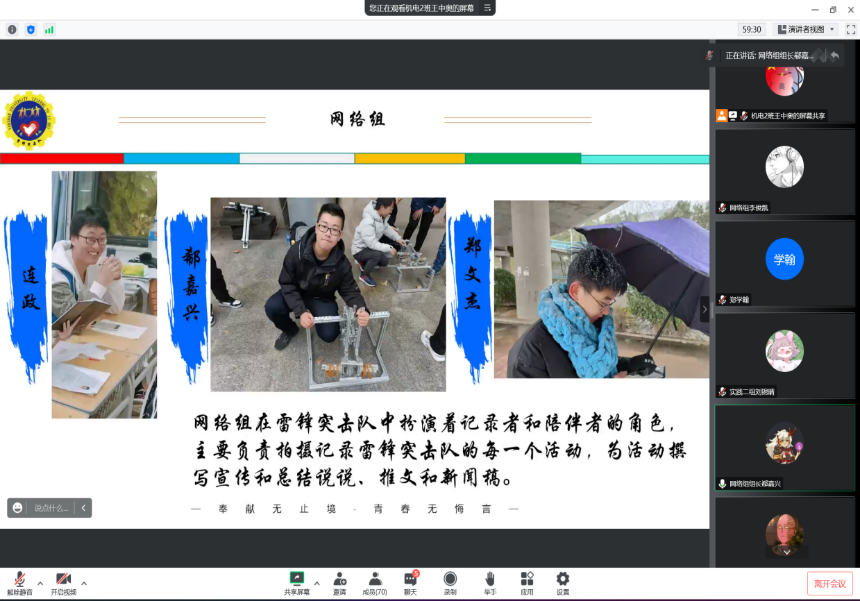 2022年10月30日,第三十四届雷锋突击队第一次全员例会通过腾讯会议线上举办。会议历时两个小时,参会成员包括5位队长,19位组长和55位新任雷锋突击队队员。