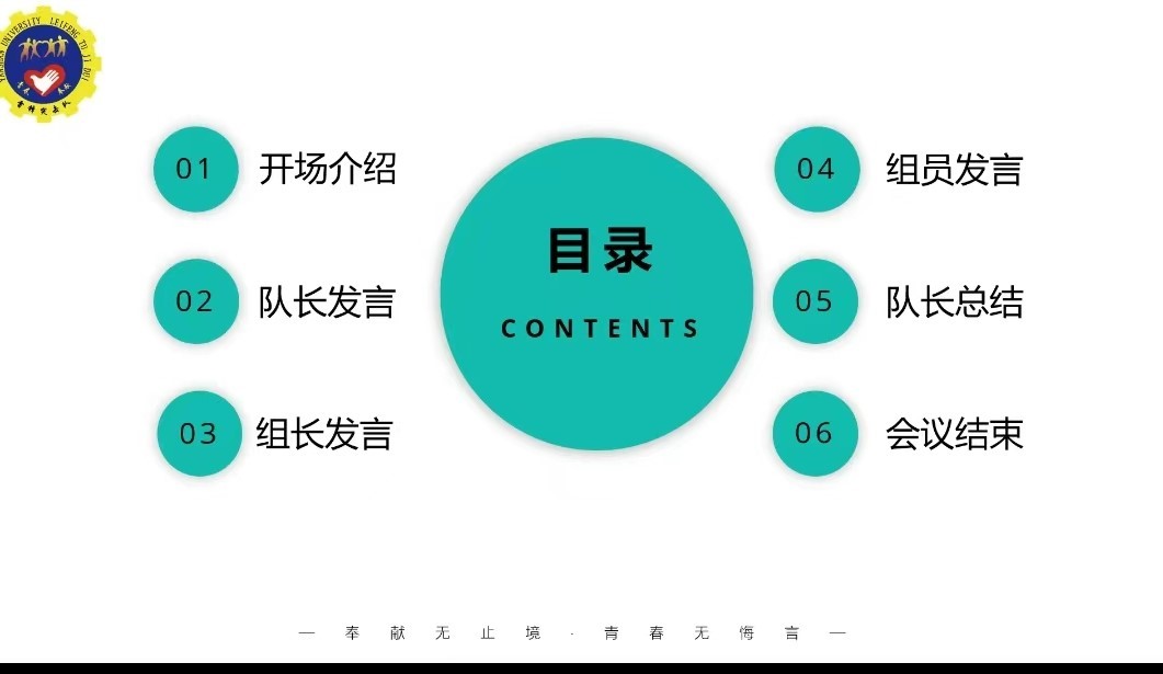 会议开始,首先主持人向大家展示了会议内容,使大家了解了会议流程。然后是主席团发言环节,队长们讲述了雷锋突击队的历史及成就,同时也和新队员们分享了生活与学习的经验。接着雷锋突击队各组组长进行发言,组长们向大家介绍各组所负责的工作内容,并表达了对雷锋突击队未来的期望和对队员的殷切期盼。接下来是各组组员代表进行发言,新队员们讲述了自己加入雷锋突击队的初衷,并表达了对雷锋突击队的期望。组员发言结束,会议进入到时空胶囊环节,队员们写下了未来一年的目标与对未来的展望。最后,队长进行会议总结,勉励同学努力学习,提升自身学识与素质,保持积极性,不断创新活动形式,以饱满的热情投身志愿服务。