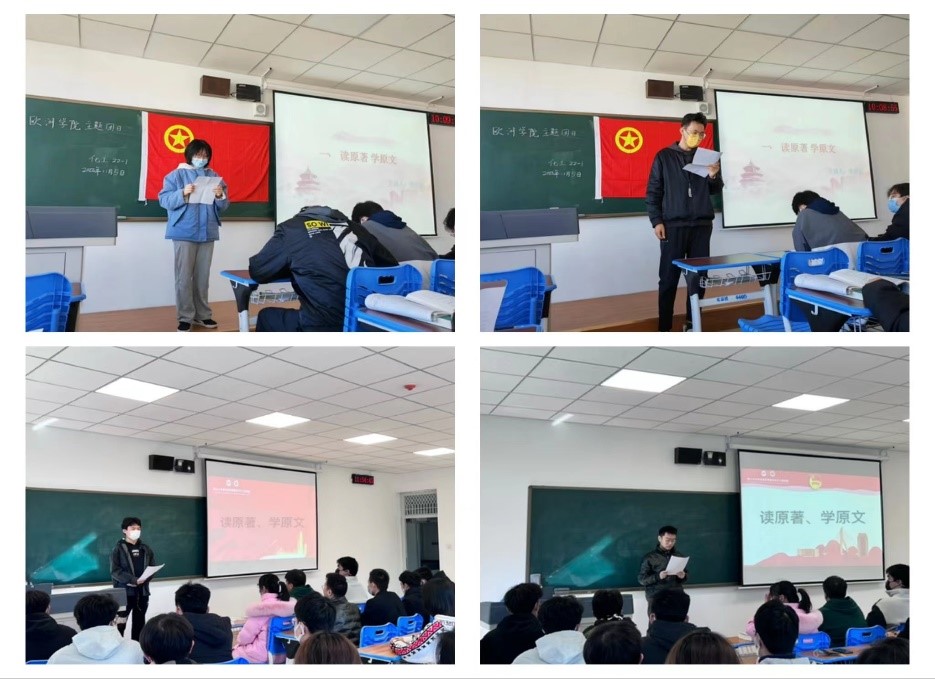 “读原著·学原文·悟原理”学习活动由各班团支书领学,精选党的二十大报告原文、《习近平谈治国理政》第四卷、习近平总书记重要讲话“金句”等重要内容,通过支部成员分段领读的形式,原原本本、逐字逐句开展学习,领会习近平新时代中国特色社会主义思想的内涵和精髓。原文学习后,各支部还开展了“悟学”环节,支部成员结合自己的学习生活经历,谈学习心得,分享感悟体会。